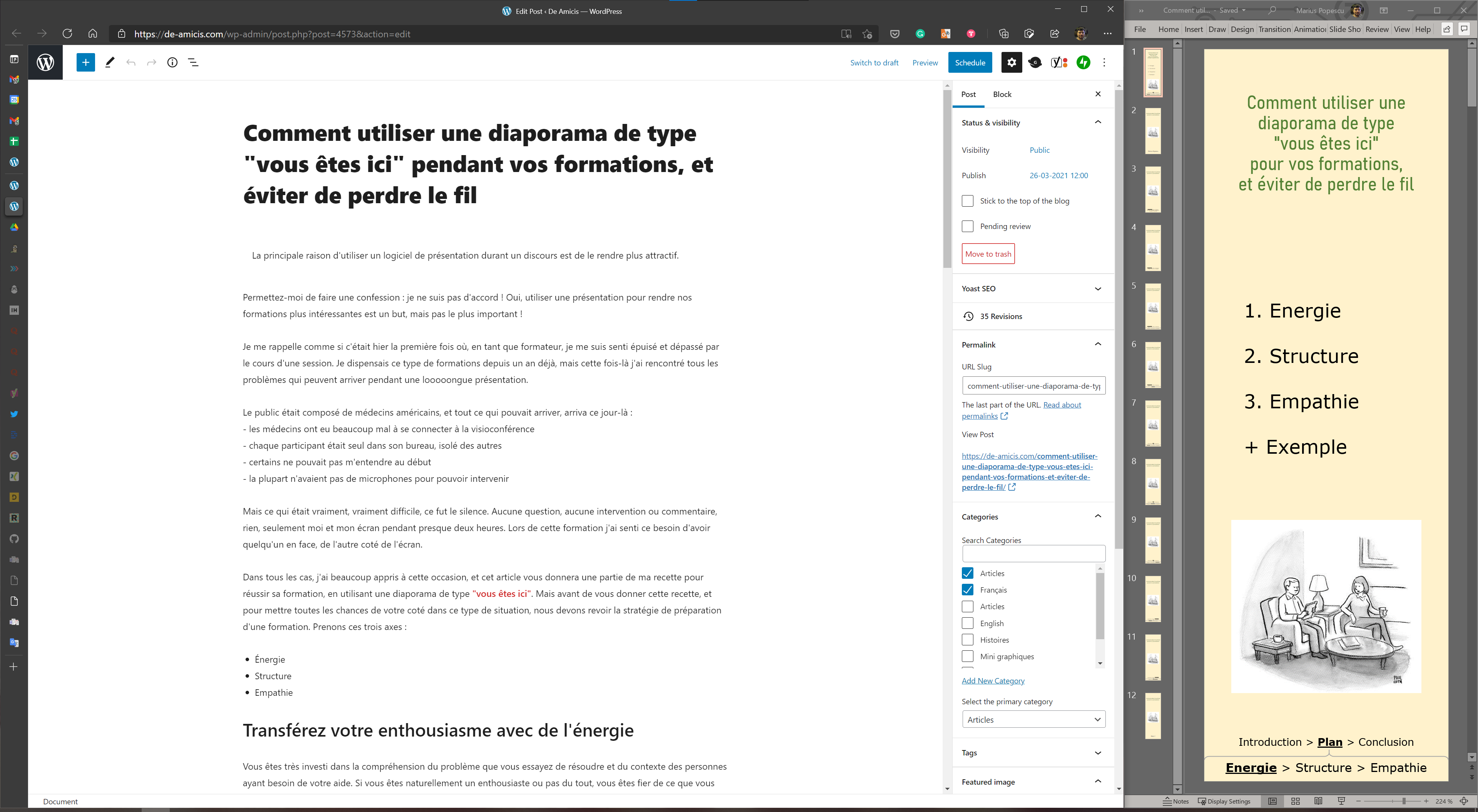 Depuis cette expérience douloureuse j’utilise ce type de PowerPoint vertical pour structurer les formations et me guider en cas de besoin : « vous êtes ici » !