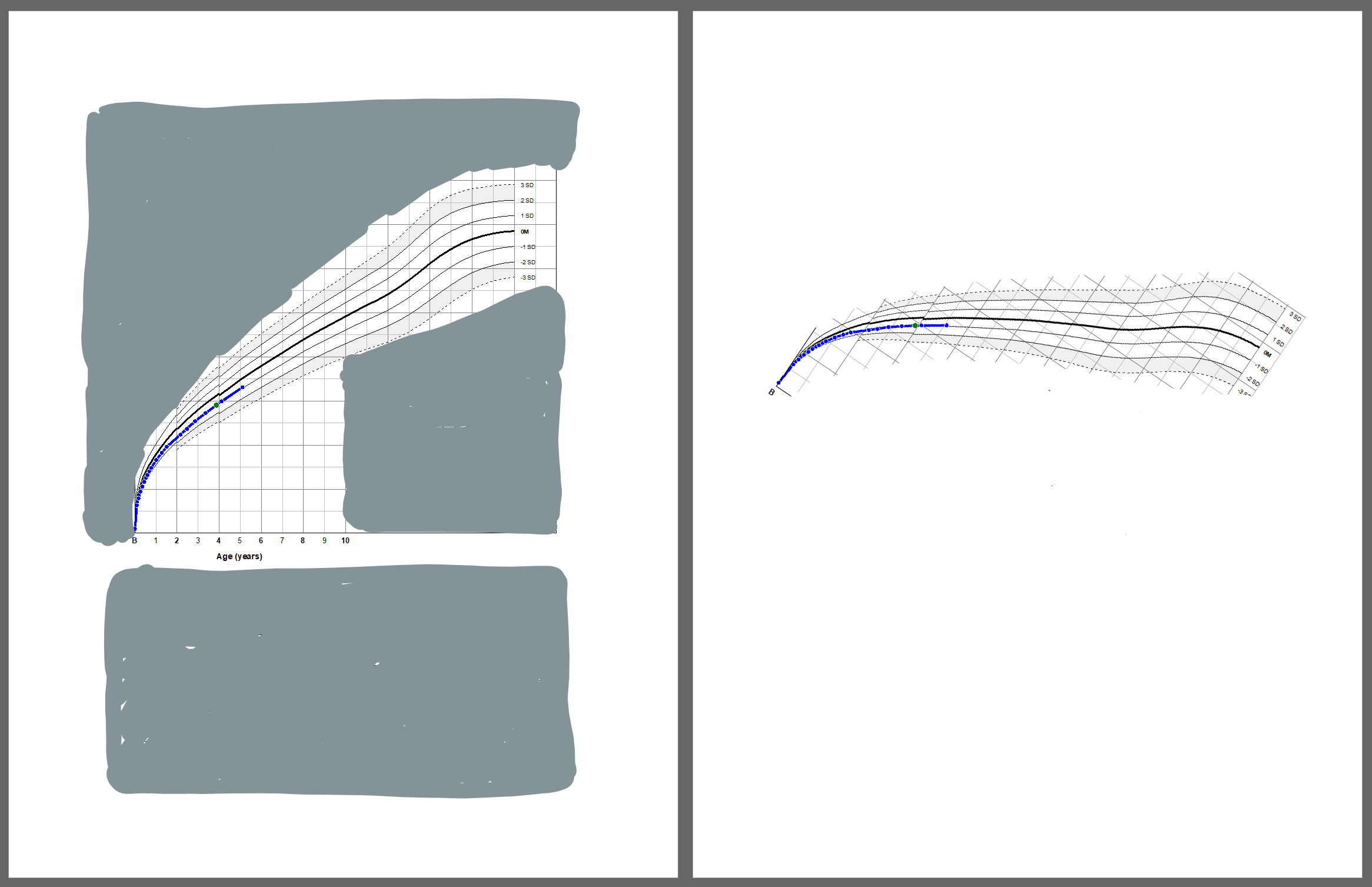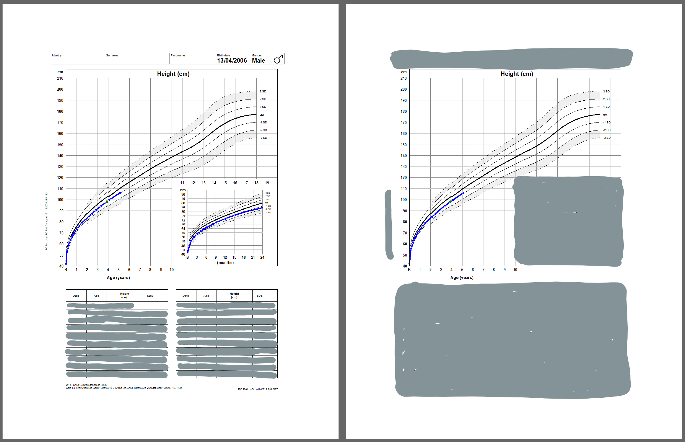 Usually, growth charts fill up a full page (even as software) and show the child’s curve points on top of country-specific references (percentile or standard deviations). These pages feature other calculations, components, and labels for parents, puberty etc.
